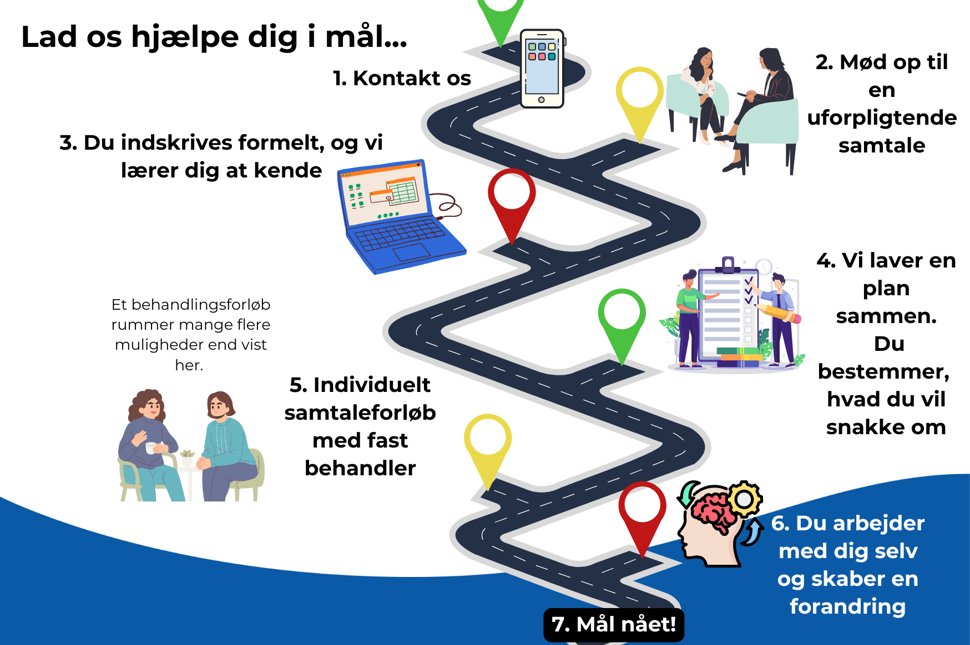SE HER - Et behandlingsforløb er altid individuelt tilrettelagt, vi planlægger det sammen med dig. I højre side ser du hvordan vi almindeligvis arbejder med metode og samtaleteknikker.
